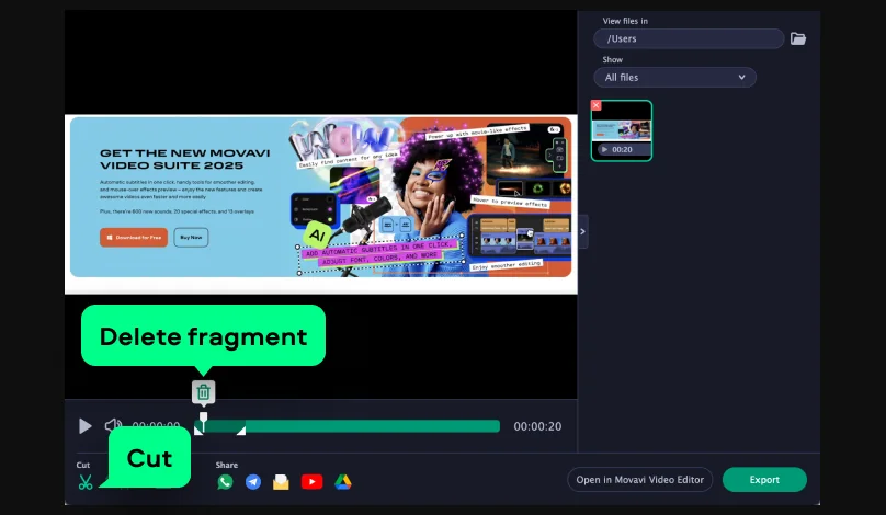 If the recording contains some unwanted segments, you can remove them. First, make one or more cuts on the timeline – place the cursor where needed and hit the Cut button. Then select the section you want to remove and click Delete fragment.