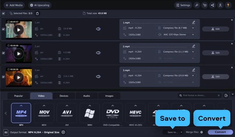 Movavi has the solution to the problem of converting AVI to MP4 on Mac. Our high-speed application can convert AVI files to any popular format, including MP4, MPEG, and MKV. Movavi Video Converter also supports batch processing for multiple files. Download Movavi Video Converter for Mac, install this powerful software, and try it yourself right now.