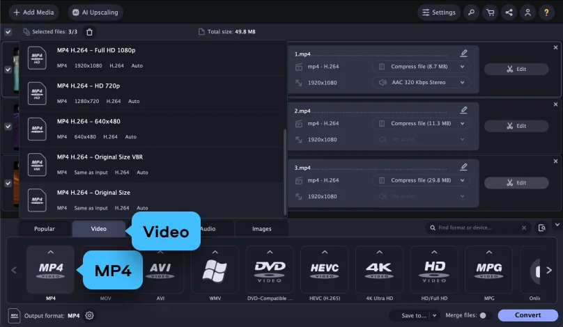 To select MP4 as your output format, open the Video tab in the bottom part of the window, click MP4, and select the MP4 preset that best suits your needs.