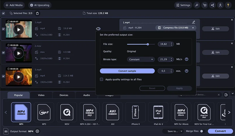 Want to convert video to MP4 format? Or maybe you need to do the reverse – convert MP4 files to some other format? In both cases, there’s no need to look for a special MPEG-4 converter – Movavi has a powerful media processing tool that supports over 180 formats, including MP4, AVI, MOV, FLV, WMV, DVD, and many more!