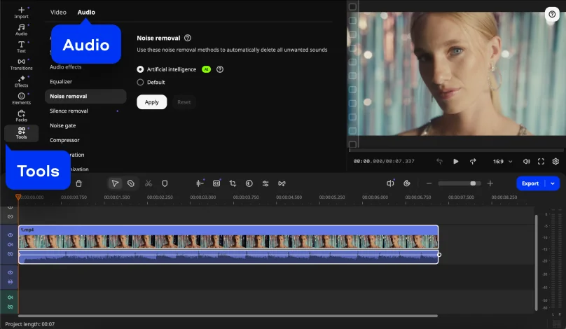 To access the audio denoise function, click Tools. Open the Audio tab and select Noise removal.