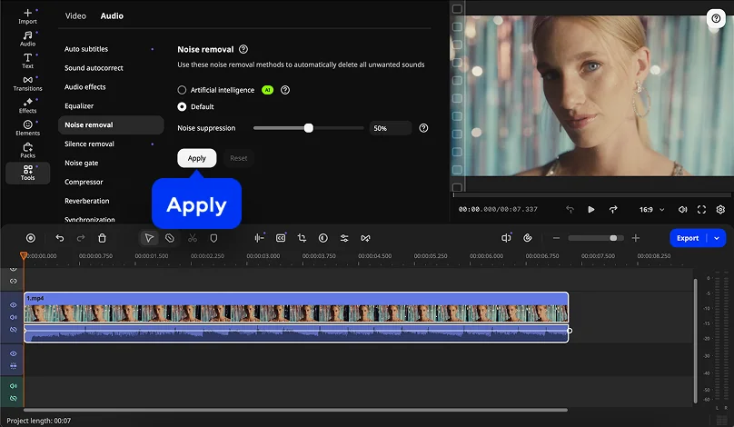 To get rid of unwanted noise from your recorded material, click Default and adjust the Noise suppression slider or use the AI-powered tool and click Apply. Experiment with different slider values until you get the best results; be aware that higher levels of noise suppression may cause distortions in the sound.