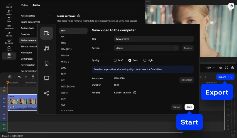 Now it’s time to save your fixed-up file. Click Export and choose the format in which to save your footage. You can choose any popular video or audio format: AVI, MP4, MOV, MP3, WAV, WMA, etc. When you’re ready to save, click the Start button.