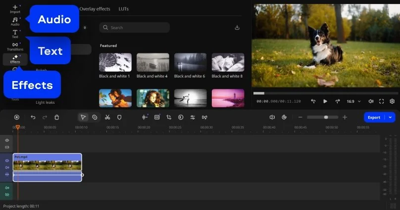 Enhance your video with stylish transitions, color filters, and animated titles. Pick royalty-free background music from Movavi’s built-in library or upload your own track for a personal touch.