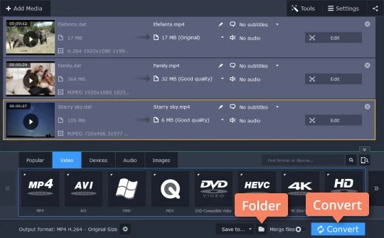 Looking for a DAT converter? Read the guide and discover how to convert DAT files to MP4 and other formats quickly with Movavi Video Converter.