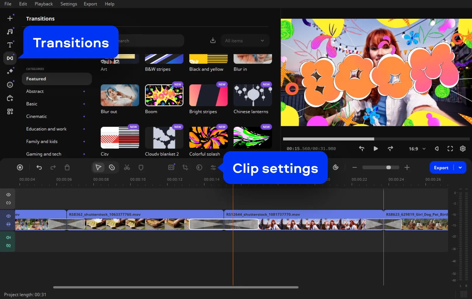 Supercharge your videos with tons of creative, professionally designed effects. Add stickers for cool accents, transitions for smoother stories, overlays for extra style, and there’s even more!