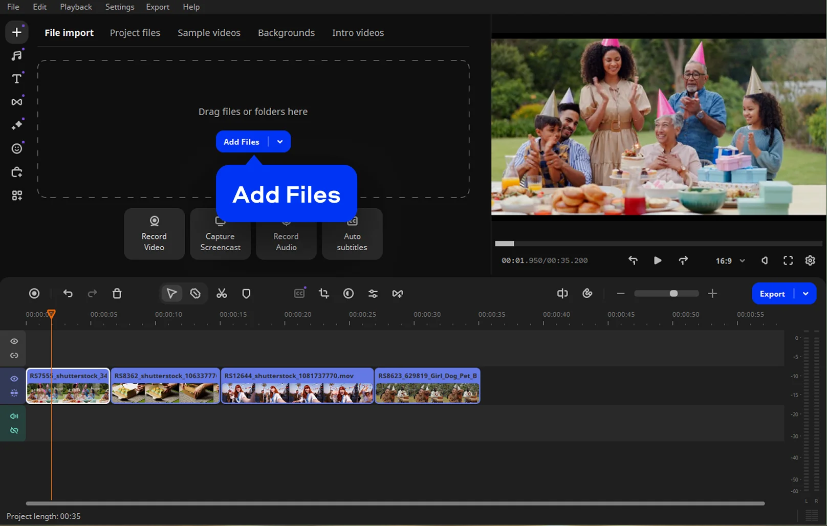 Launch Movavi Video Editor – a powerful alternative to an online birthday video maker. Drop in your photos, images, video clips, and music, then line them up on the timeline to create a fully personalized birthday video.