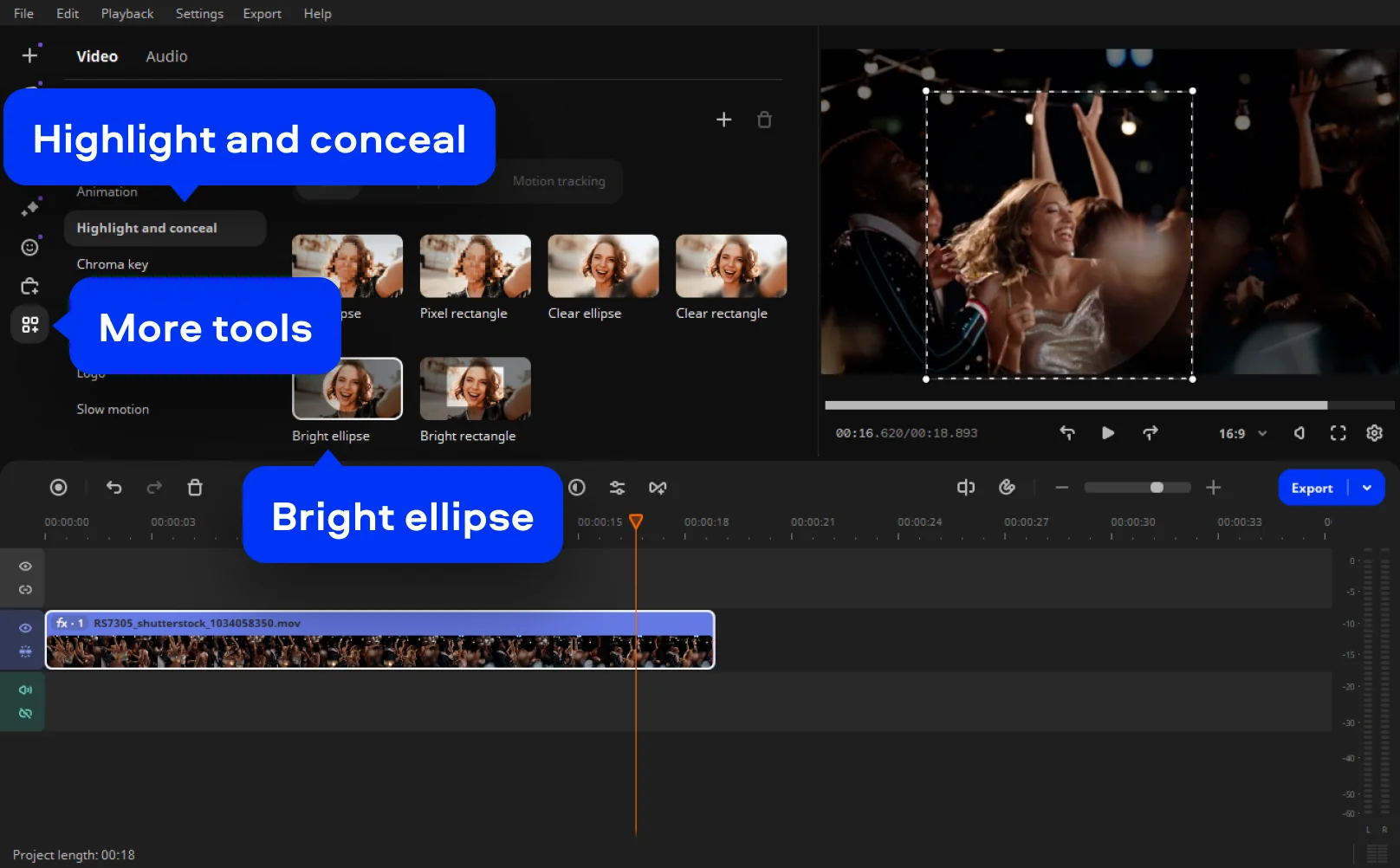 Open the More tools > Highlight and conceal tab and select Bright ellipse for example. Apply it to the clip, then resize and reposition the overlay directly in the preview window until it covers exactly what you want hidden.