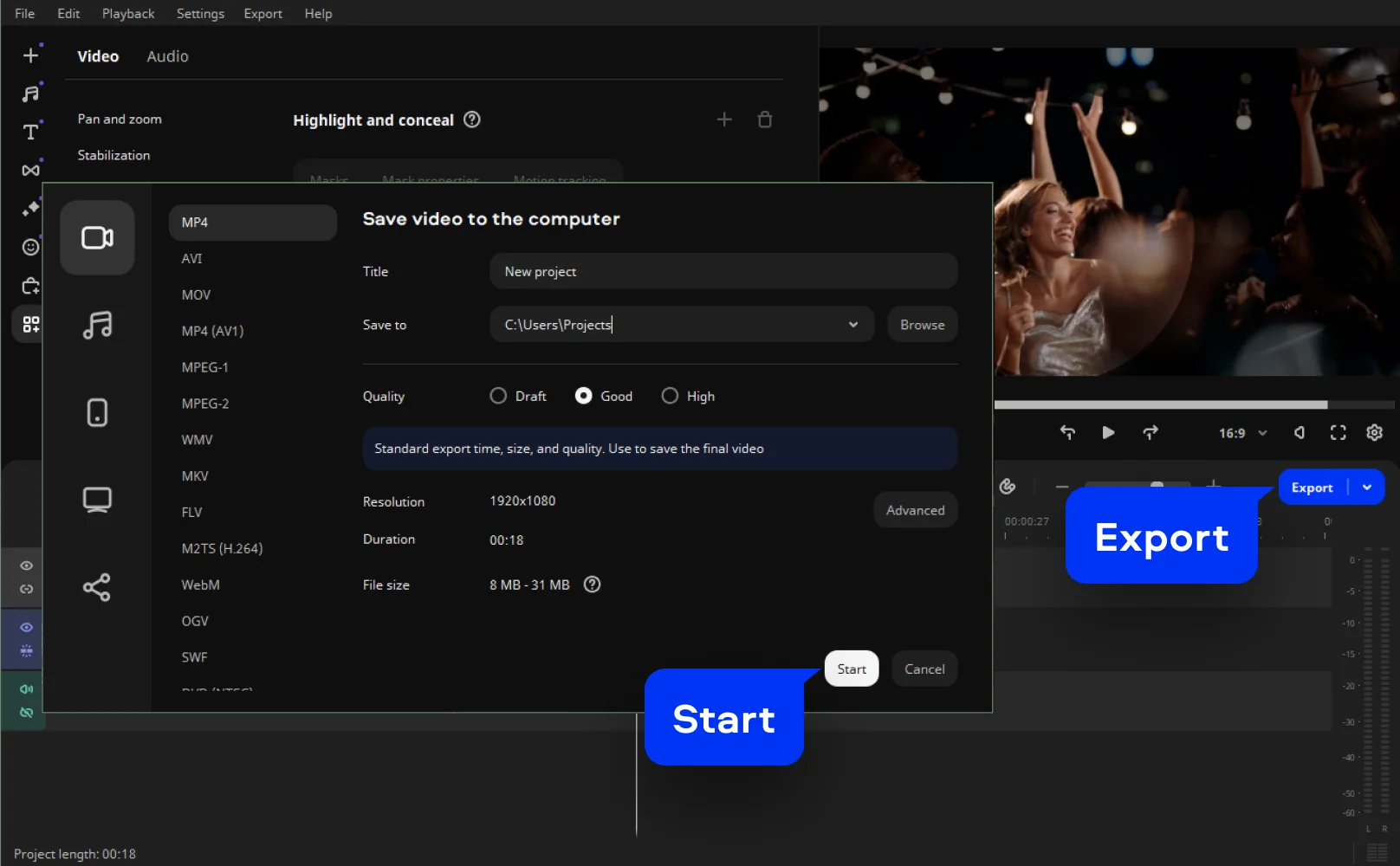 *The free version of Movavi Video Editor may have the following restrictions depending on the build: watermark on exported clips, 60-second video or 1/2 audio length limit, and/or some advanced features unavailable when exporting videos.