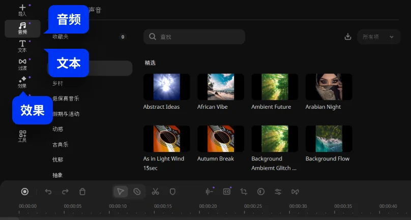 效果现已激活,随时可供您使用。您可以在程序窗口左侧的选项卡中找到 Movavi Effects 内容。点击各个选项卡,查看可用的音乐曲目、标题、过渡等。