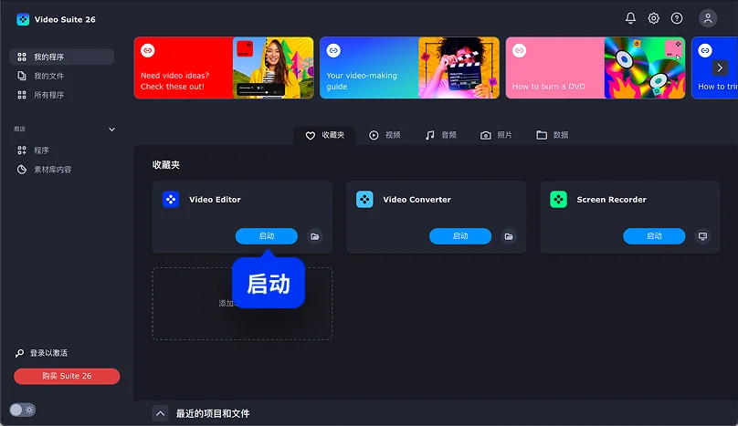 从主程序屏幕启动 Video Editor。您可以在默认打开的收藏夹选项卡或程序部分中找到该应用。