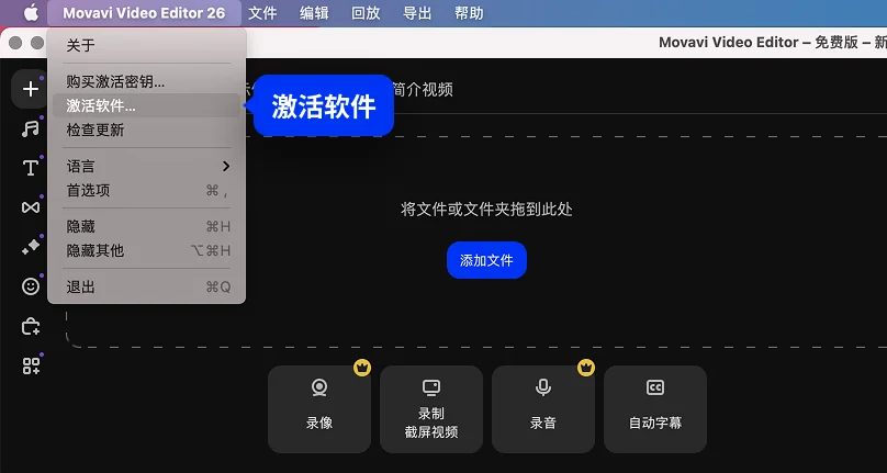 在 Movavi Video Editor 中,进入主程序菜单并选择激活软件。