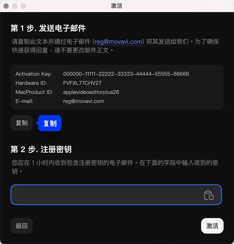 Movavi 的大部分程序都有两种版本:Windows 版和 macOS 版。确保激活电子邮件中列出了正确的操作系统。否则,请联系 Movavi 支持团队。 - 如果您尝试脱机激活,请确保将激活密钥和注册密钥已粘贴到正确的字段中。