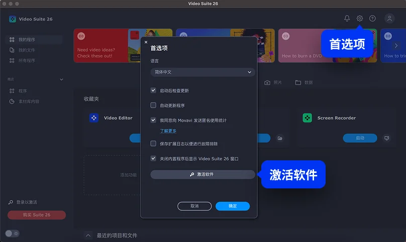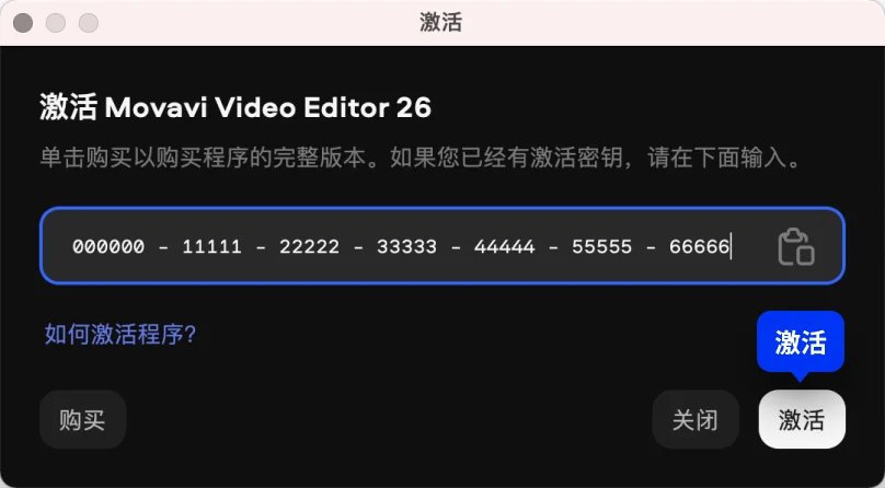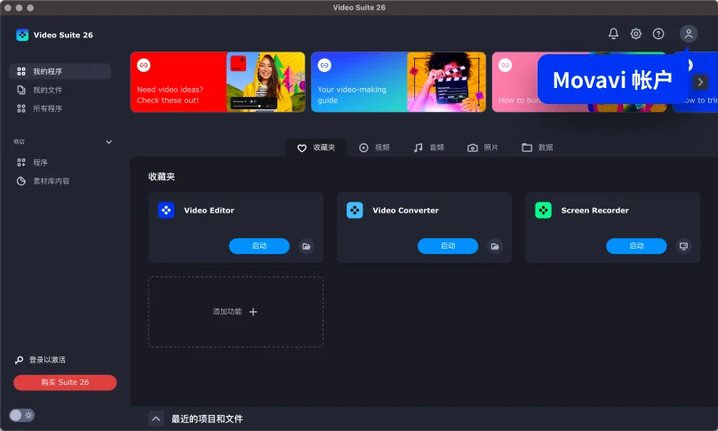 可以通过三种方式激活 Movavi Video Suite:登录您的 Movavi 帐户;在 Video Suite 中输入激活密钥;通过 Video Suite 中包含的一个程序。