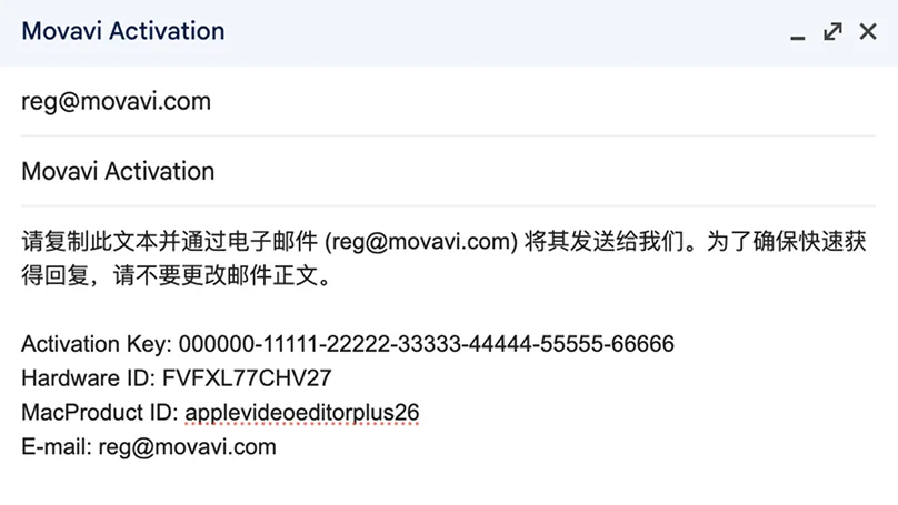在您可以上网时,使用您常用的邮件客户端撰写电子邮件。在电子邮件正文中,请粘贴您从“激活”对话框中复制的信息。然后将电子邮件发送至 reg@movavi.com.
