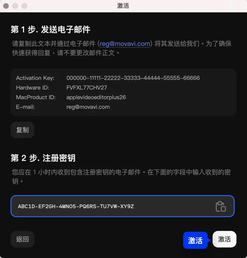 激活密钥 位于您在购买后收到的电子邮件中。它只包含数字。注册密钥 位于您从 support@movavi.com 收到的电子邮件中。电子邮件的主题是 激活信息 (Activation Information)。此密钥由数字和大写拉丁字符组成。