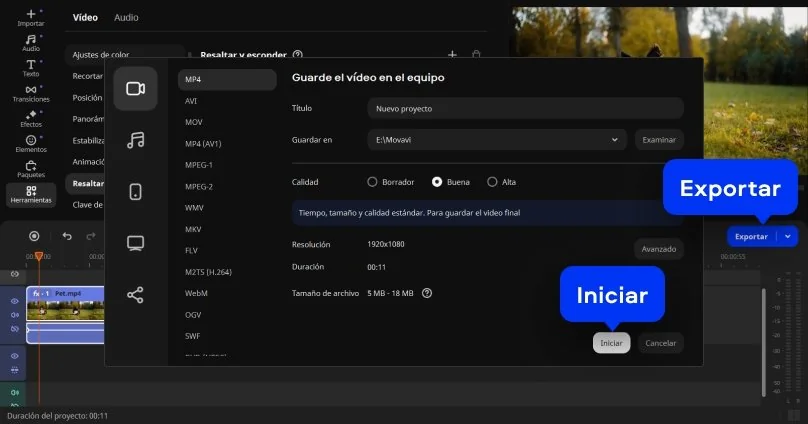 Cuando estés conforme, haz clic en Exportar, selecciona el formato, la resolución y la carpeta de destino. Pulsa Iniciar para guardar el archivo final con el desenfoque aplicado y compartir tu vídeo en línea.
