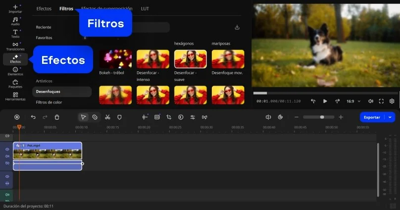 Abre la pestaña Efectos > Filtros, selecciona la categoría Desenfoques y elige un filtro como Desenfocar – suave o Desenfocar – intenso. Arrastra el filtro hasta tu clip en la línea de tiempo y ajusta la intensidad del efecto en la ventana de vista previa.