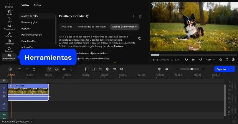 Si quieres ocultar una parte concreta, selecciona el clip y abre Herramientas > Resaltar y esconder. Coloca el marco sobre la zona deseada y activa Rastreo de movimiento para que el desenfoque siga el movimiento del objeto o del rostro.