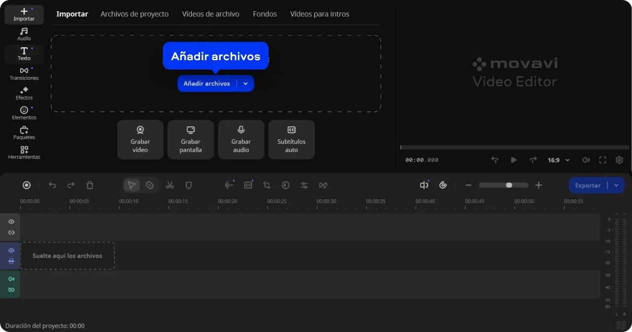 *La versión gratuita de Movavi Video Editor podría tener las restricciones siguientes en función de la compilación: marca de agua en los clips exportados, límite de 60 segundos en el vídeo o del 1/2 en el audio, o algunas características avanzadas no disponibles al exportar vídeos.