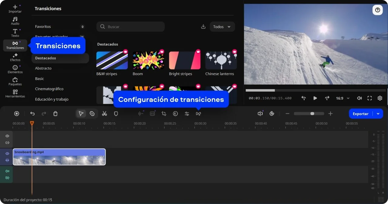 Para ello, abre la pestaña Transiciones y selecciona las transiciones que te gusten. Arrástralas a la línea de tiempo entre cada clip para añadirlas. También puedes utilizar el Configuración de transiciones para añadir rápidamente transiciones aleatorias o elegir una para utilizarla en todo el vídeo.