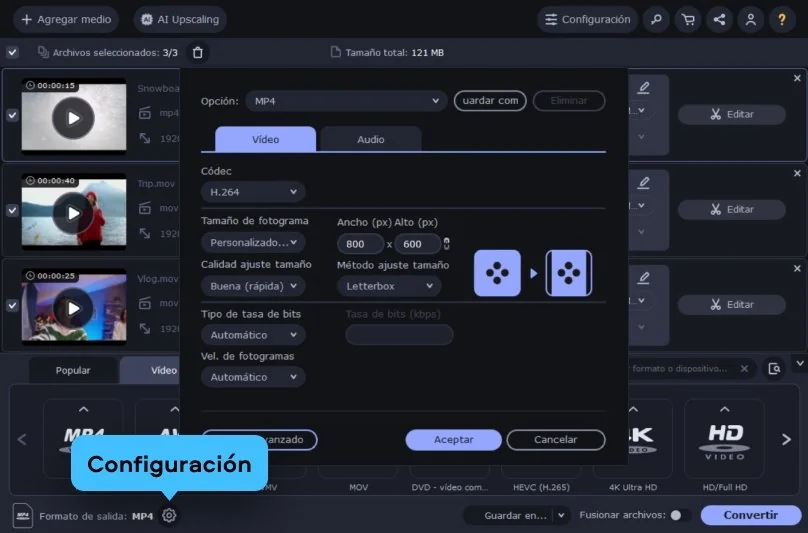Haz clic en el icono de engranaje junto al formato elegido. Esto abrirá la ventana de Configuración, donde puedes ajustar parámetros como resolución, códec y método de redimensionado.