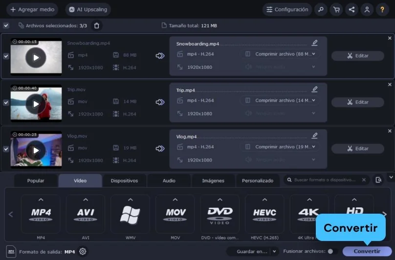 Un MP4 puede volverse más manejable si ajustas un par de cosas. Reduce un poco la resolución, revisa el bitrate o pasa el vídeo a un códec más moderno como H.264 o H.265. Con Movavi solo tienes que abrir el archivo, escoger un perfil más ligero y dejar que la conversión siga su curso.