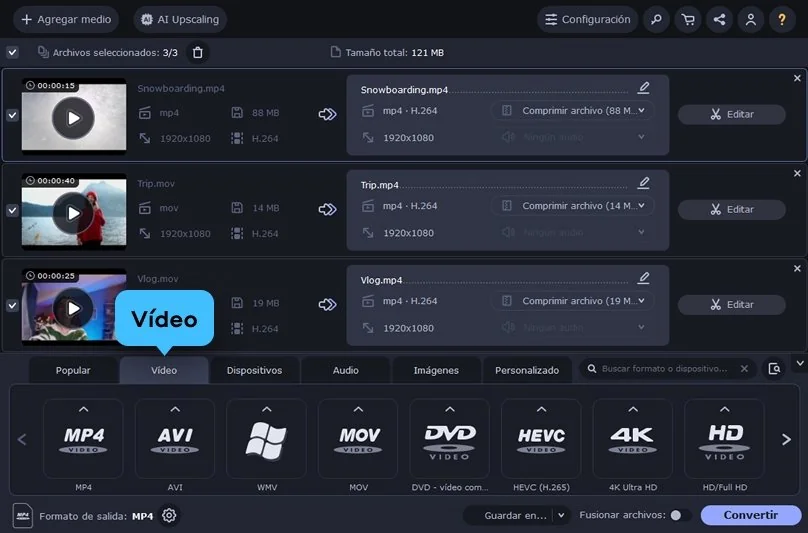 En la parte inferior, selecciona el formato de salida que prefieras. Puedes elegir un formato estándar, uno compatible con tu dispositivo o mantener el mismo tipo de archivo del vídeo original.