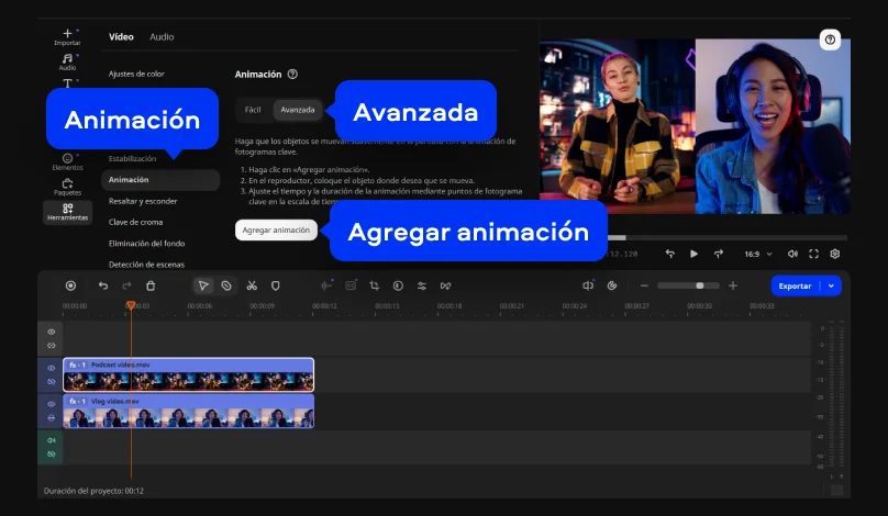 Si quieres, puedes añadir movimiento a tus clips en primer plano. Para ello, seleccione un vídeo en la línea de tiempo, vaya al menú Animación, abra la sección Avanzada y haga clic en Agregar animación.
