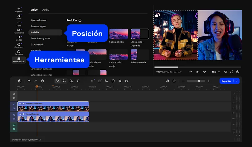 Puedes elegir cómo y dónde se colocará el vídeo superpuesto sobre el vídeo de fondo. Abra Herramientas > Posición y seleccione una de estas opciones: Imagen en imagen, Lado a lado o Superposición.