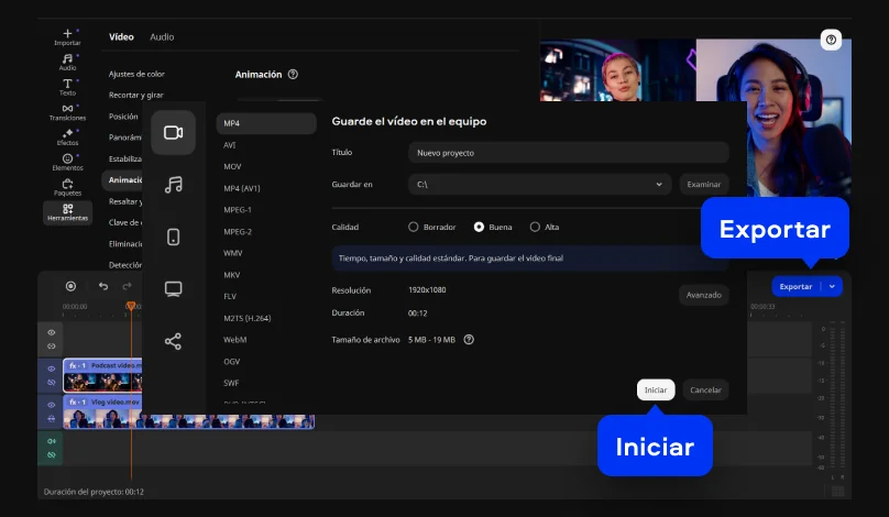 Haz clic en el botón Exportar, elige la carpeta de destino en el campo Guardar en y selecciona el formato de vídeo en las pestañas de la izquierda de la ventana de exportación. A continuación, haz clic en Iniciar. Ahora ya sabes cómo superponer un vídeo a otro utilizando el software de Movavi.