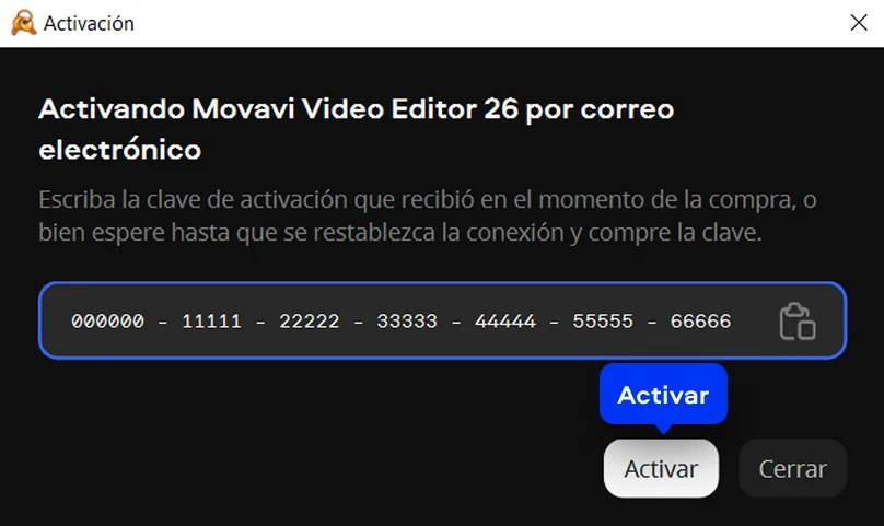 La Activación por Internet es la forma más rápida y fácil de activar su software de Movavi si su equipo está conectado a Internet. Si tu equipo no tiene una conexión a Internet fiable, o si tienes problemas con la activación en línea, ve a Activación sin conexión.