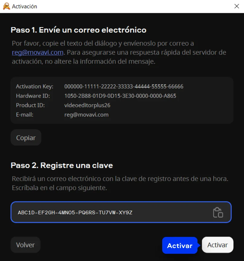 Debió recibir su clave de registro en un correo electrónico de support@movavi.com. El asunto del correo electrónico es Activation Information. Esta clave consta de dígitos y caracteres latinos en mayúsculas.