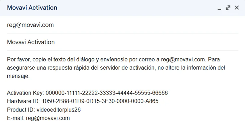 Cuando tenga acceso a Internet, use su cliente de correo electrónico preferido para crear un mensaje de correo electrónico. Pegue en el cuerpo del mensaje la información que copió del cuadro de diálogo de Activación y luego envíe el correo electrónico a reg@movavi.com.