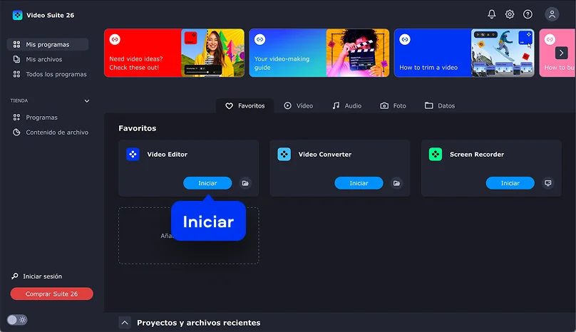 Inicia Video Editor desde la pantalla principal del programa. Puedes encontrar la aplicación en la pestaña Favoritos, que está abierta de manera predeterminada, o en la sección Programas.
