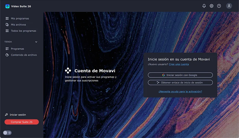Hay tres maneras de activar Movavi Video Suite: iniciando sesión en tu cuenta de Movavi; ingresando la clave de activación en Video Suite; o a través de uno de los programas incluidos en Video Suite.