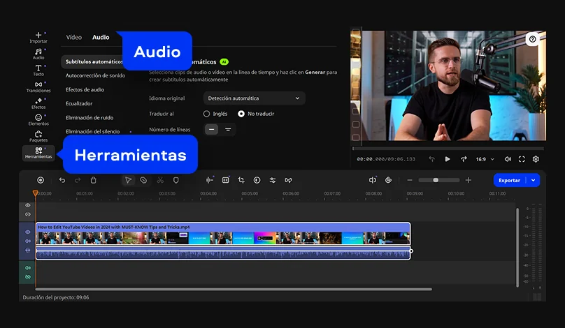 Haz clic en tu video en la línea de tiempo y abre Más herramientas. En la pestaña Audio, encontrarás la opción Subtítulos automáticos.