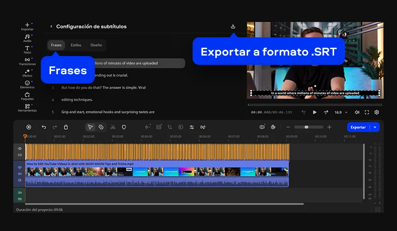 Cuando los subtítulos estén listos, verás todas las líneas en la pestaña Frases. Si lo necesitas, puedes editar el texto.
