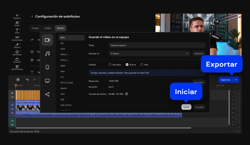 ¡Genial! Ahora es el momento de guardar el video. Presiona el botón Exportar, ajusta las configuraciones de salida y haz clic en Iniciar.