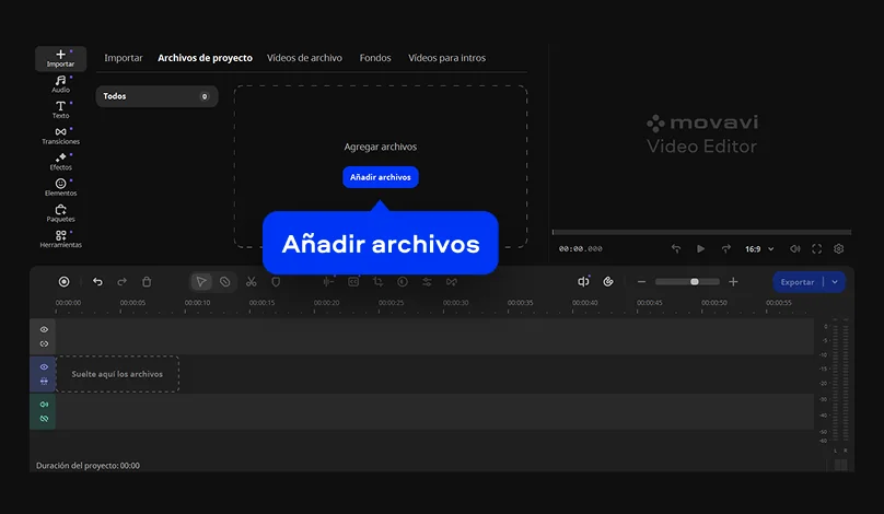 Haz clic en Añadir archivos y selecciona tu video. Luego arrastra y suelta el archivo en la línea de tiempo.