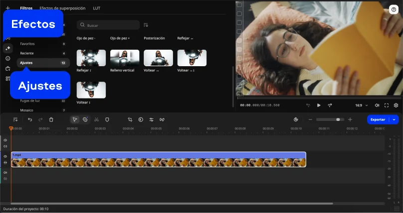 En el panel izquierdo, selecciona Efectos > Filtros > Ajustes. Dentro de esta categoría encontrarás la opción Voltear (flip video), que te permite aplicar el efecto de inversión al vídeo con un solo movimiento, sin necesidad de ajustes adicionales.