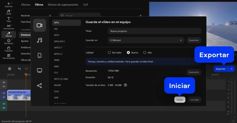La herramienta online de Movavi permite añadir filtros a un video directamente en el navegador, sin instalar programas ni configurar software adicional. Solo tienes que subir tu archivo y usar el editor para modificar el aspecto visual del clip en pocos pasos.