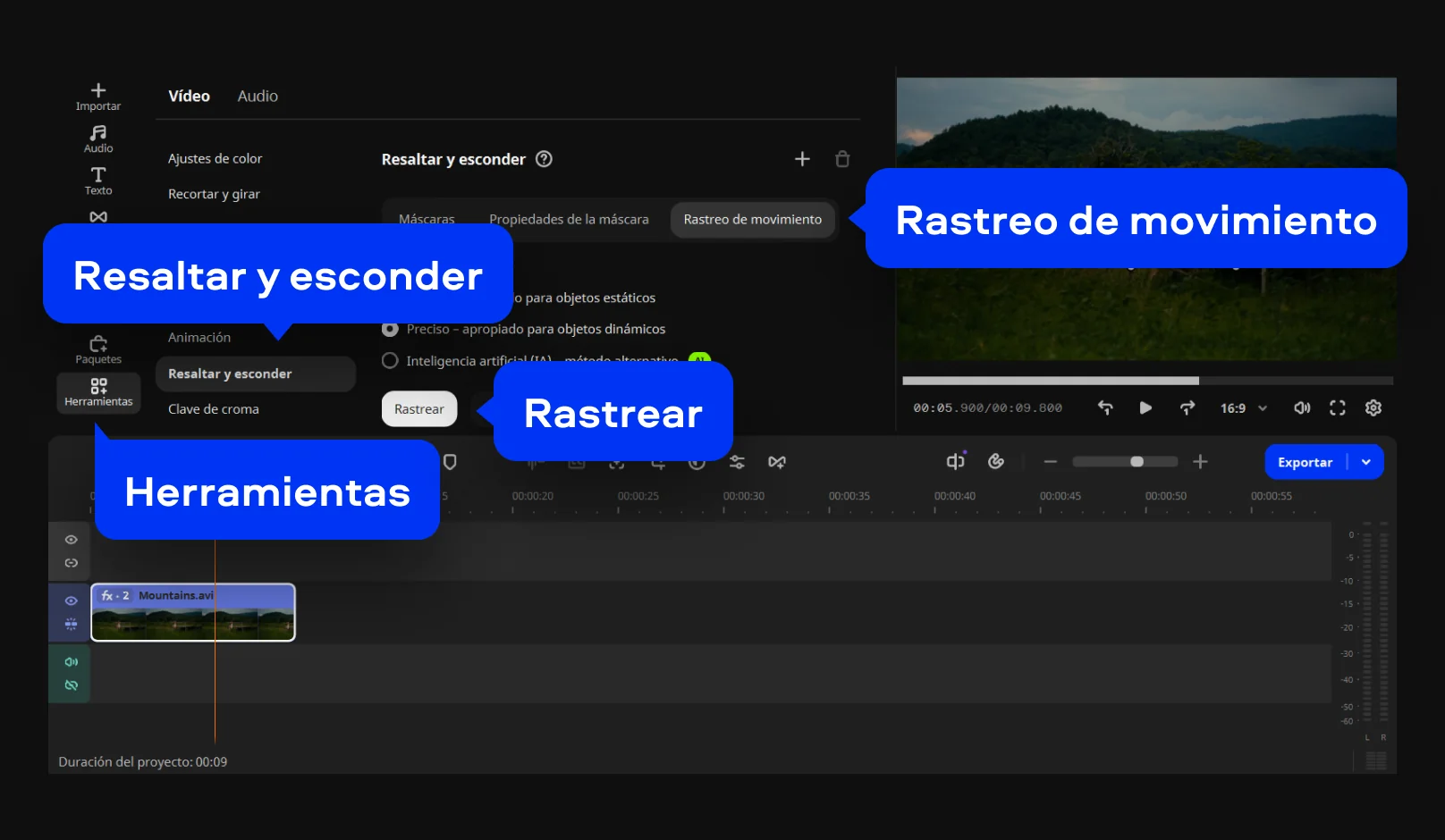 Si quieres ocultar una parte concreta, selecciona el clip y abre Herramientas > Resaltar y esconder. Coloca el marco sobre la zona deseada y activa Rastreo de movimiento para que el desenfoque siga el movimiento del objeto o del rostro.