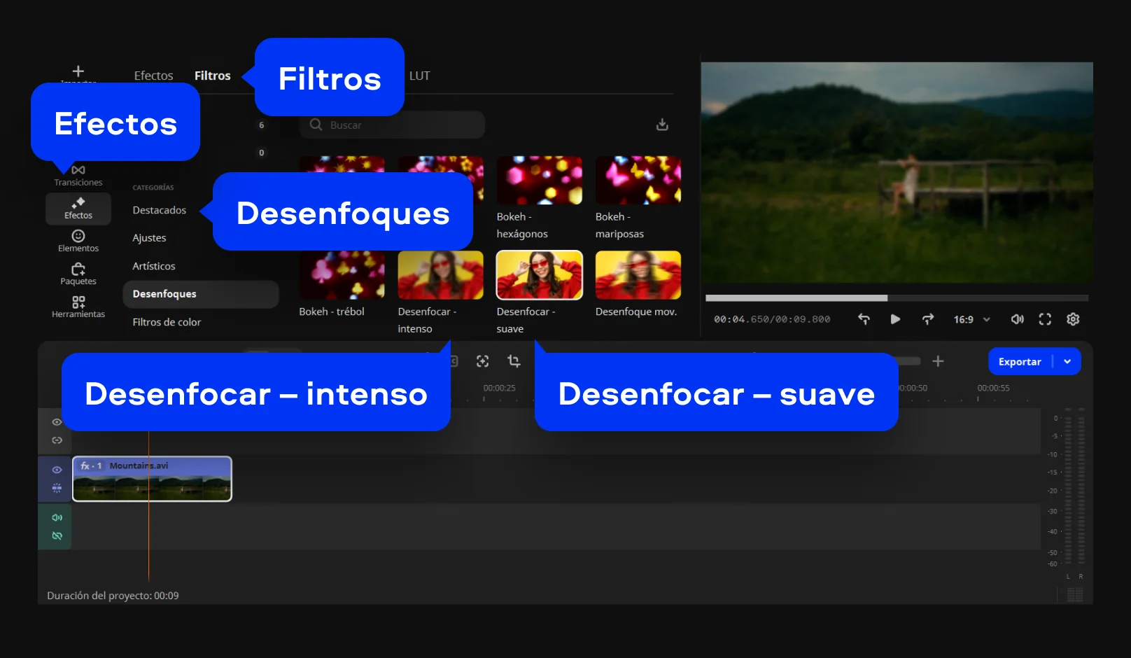 Abre la pestaña Efectos > Filtros, selecciona la categoría Desenfoques (especialmente útil para difuminar fondo de vídeo) y elige un filtro como Desenfocar – suave o Desenfocar – intenso. Arrastra el filtro hasta tu clip en la línea de tiempo y ajusta la intensidad del efecto en la ventana de vista previa.