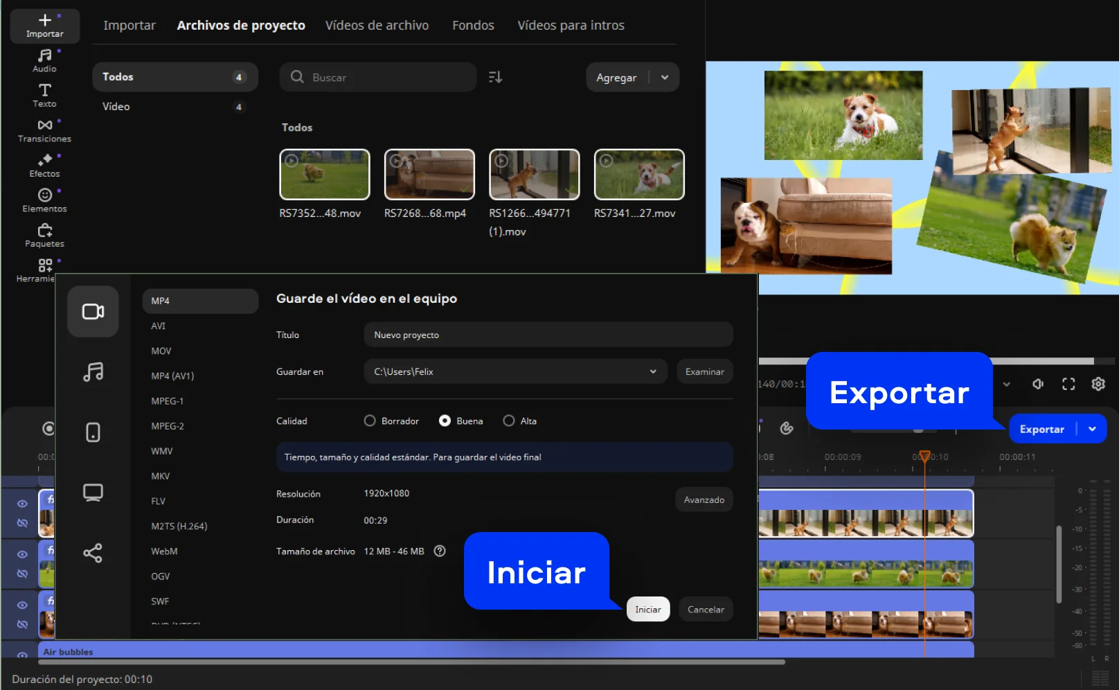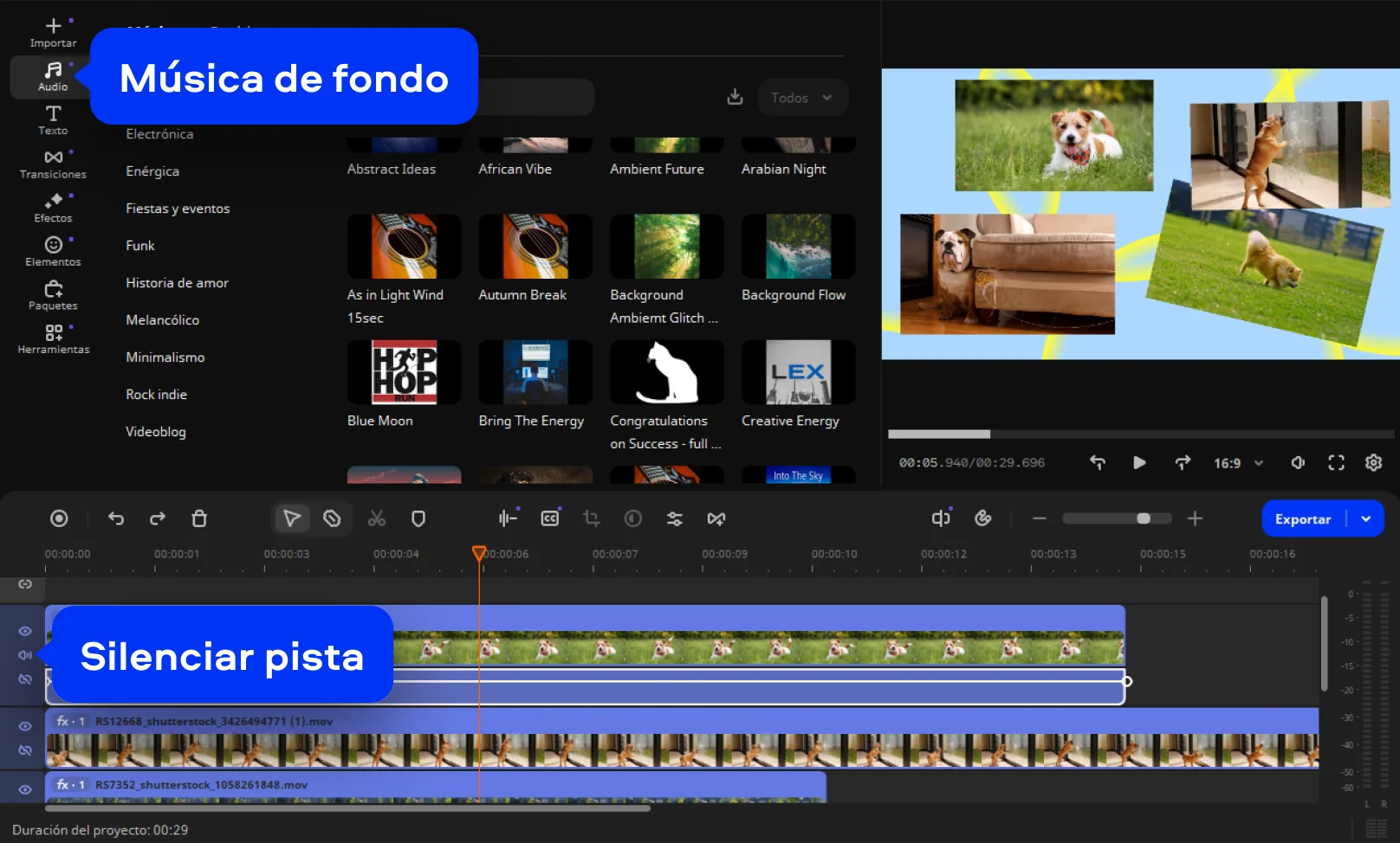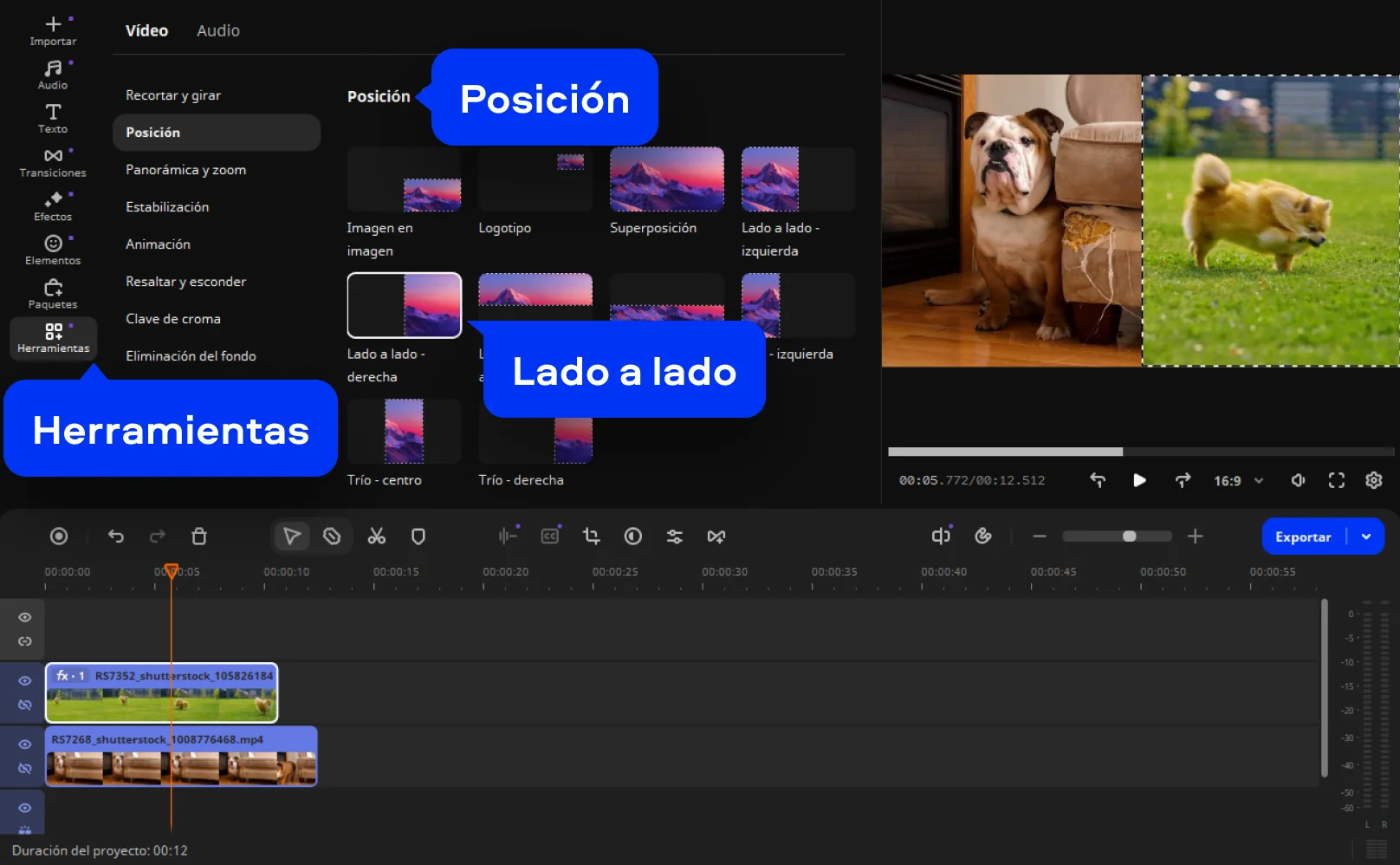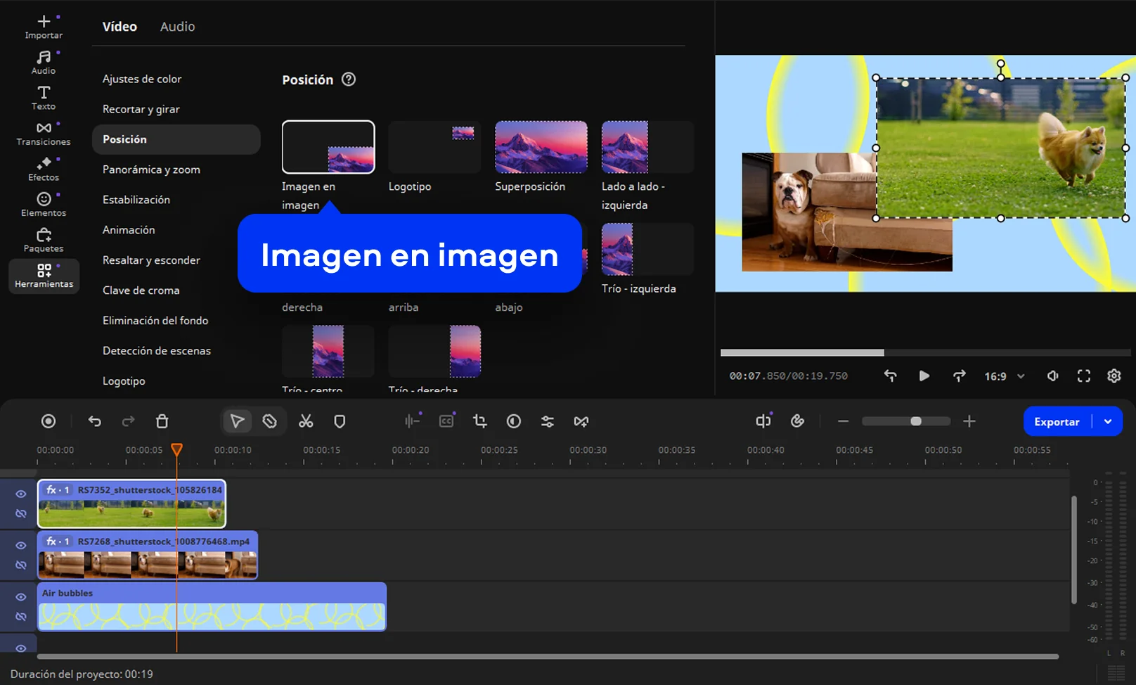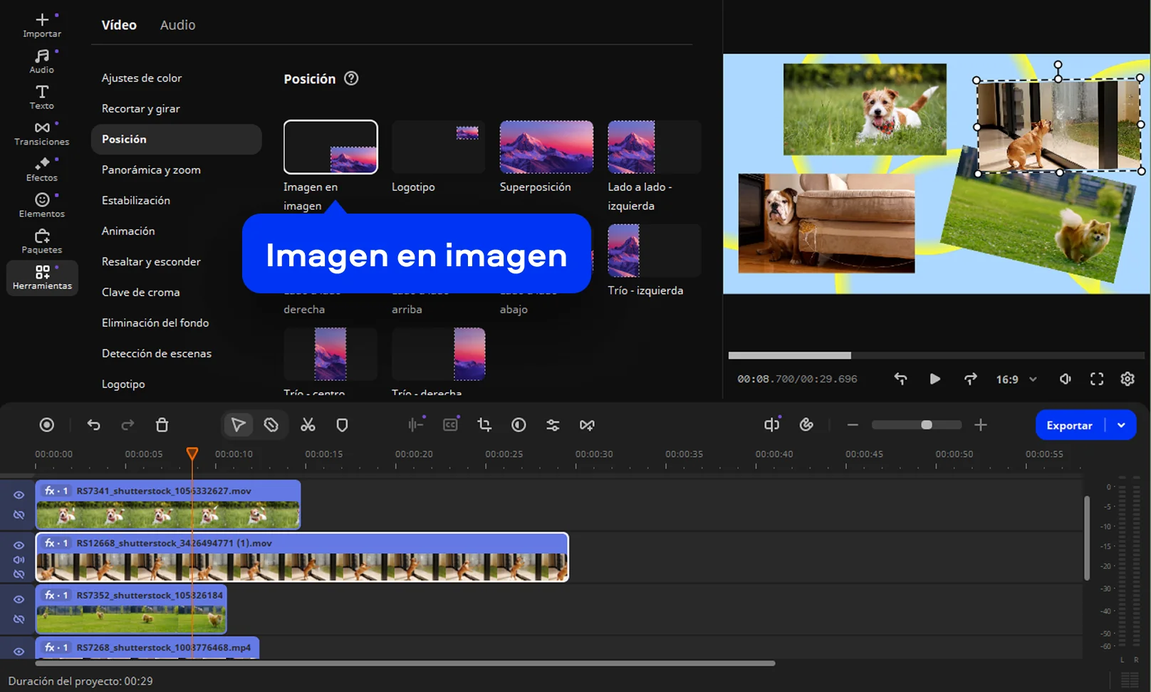 Para crear un vídeo multipantalla, haz clic en el primer vídeo de la Pista extra de vídeo y selecciona Herramientas > Posición. Selecciona la opción Imagen en imagen en la lista sobre la ventana de vista previa. Arrastra los bordes del vídeo para cambiar su tamaño. Arrastra y suelta el clip para colocarlo sobre el fondo. Repite estas acciones con todos los vídeos de la Pista extra de vídeo.