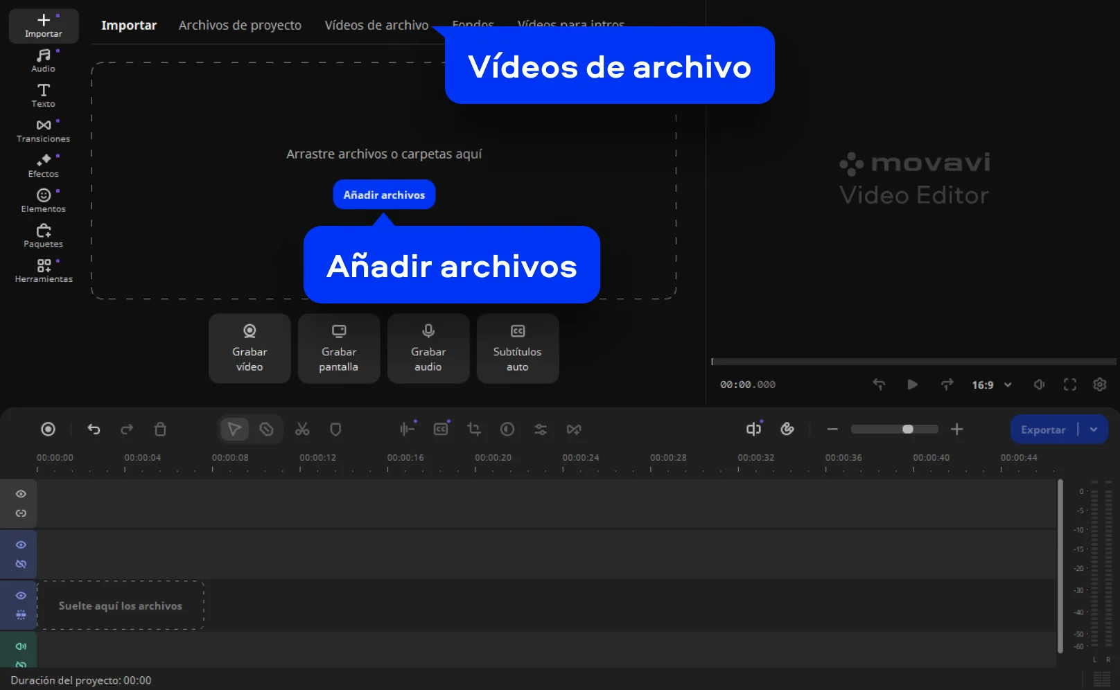 Con Movavi Video Editor, puedes poner tantos vídeos uno al lado del otro como desees. Para hacerlo, primero añada una imagen de fondo para tus vídeos. Abre la pestaña Importar, haz clic en Añadir archivos y selecciona una imagen. Para añadir más vídeos a tu proyecto, haz clic de nuevo en Añadir archivos y selecciona los clips. Mueve los archivos a la Pista de vídeo junto con la imagen de fondo que añadiste anteriormente.