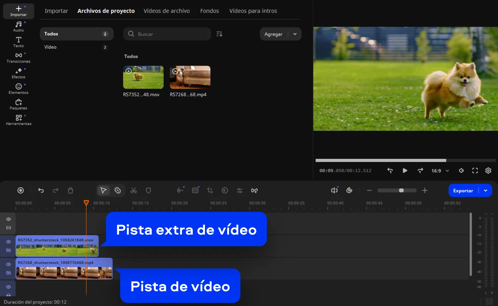 Ahora debes mover todos los vídeos a la pista superpuesta (superior). Asegúrate de que la imagen de fondo permanece en la pista de vídeo principal (inferior).