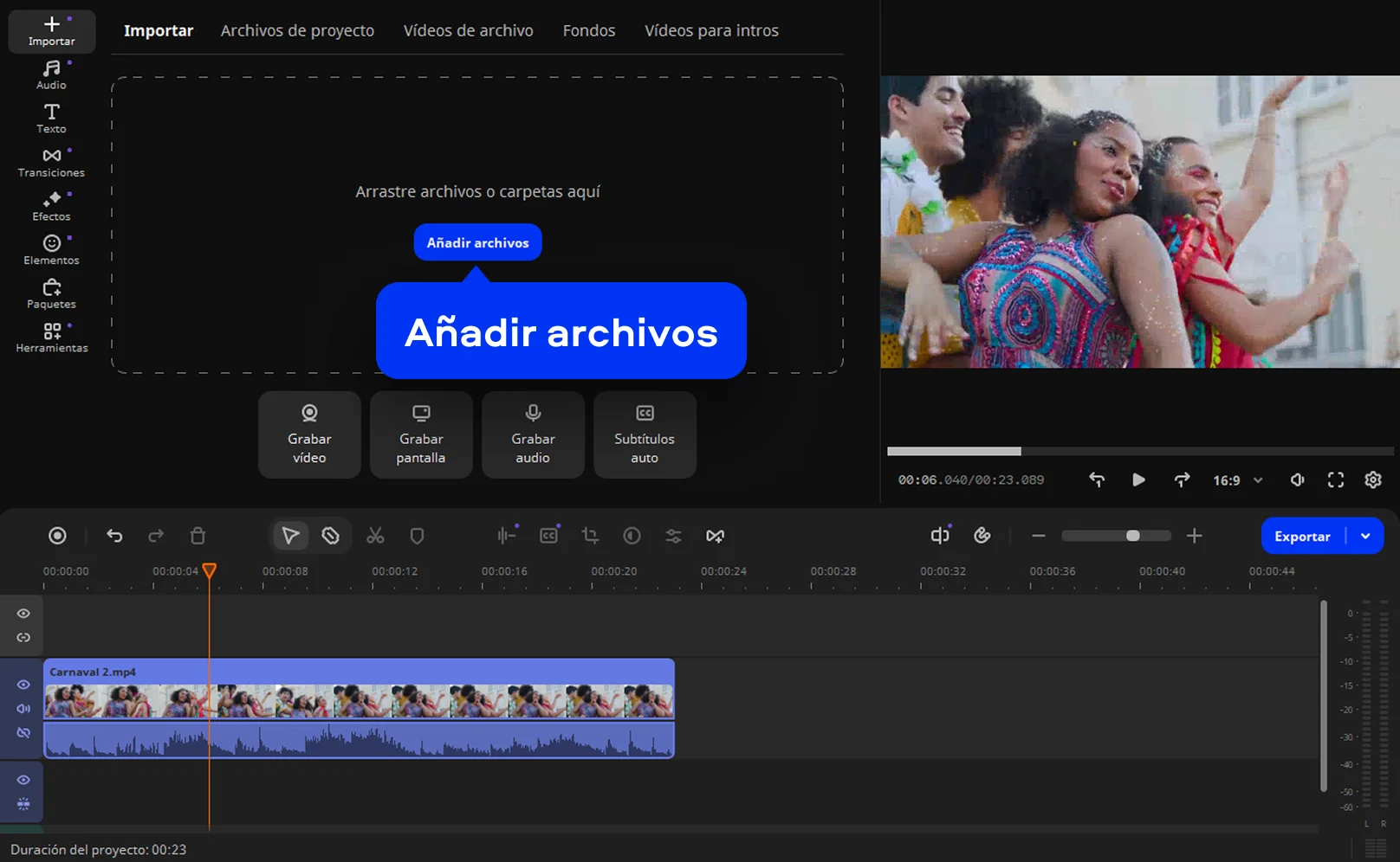 Antes de poder comenzar a normalizar audio del video, importa tus archivos MP3 o cualquier otro formato de audio o vídeo haciendo clic en Añadir archivos. Acto seguido, aparecerán en tu Archivos de proyecto. Arrástralos a la Línea de tiempo.