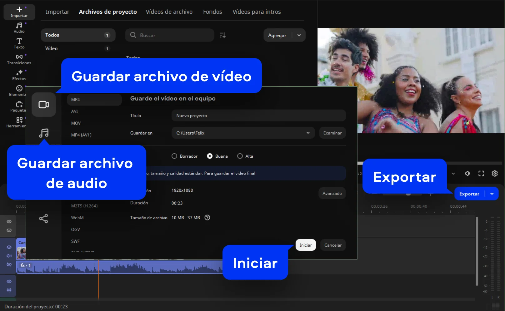 Haz clic en el botón Exportar. En la ventana que aparece, selecciona la opción apropiada. Para exportar un vídeo, asegúrate de que Guardar archivo de vídeo está seleccionado. Para exportar audio, haz clic en Guardar archivo de audio. Elige el mejor formato para tu archivo. Los vídeos pueden guardarse en MP4, MOV, AVI y MKV; los archivos de audio en MP3, FLAC, WAV y Ogg. Especifica el título, carpeta de destino y calidad y, finalmente, haz clic en Iniciar.