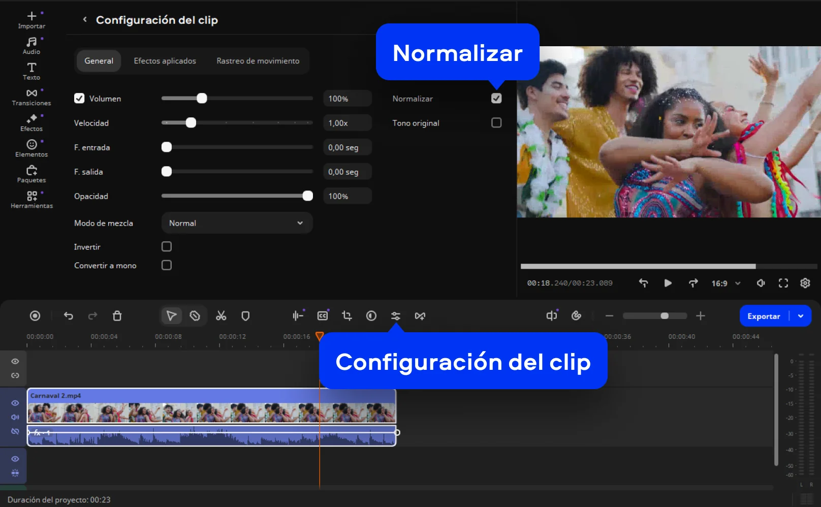 Haz doble clic en el vídeo o el audio en la Línea de tiempo y abre Configuración del clip. En la pestaña General, ubica Normalizar. Esto comenzará a normalizar volumen del audio en toda la pista.